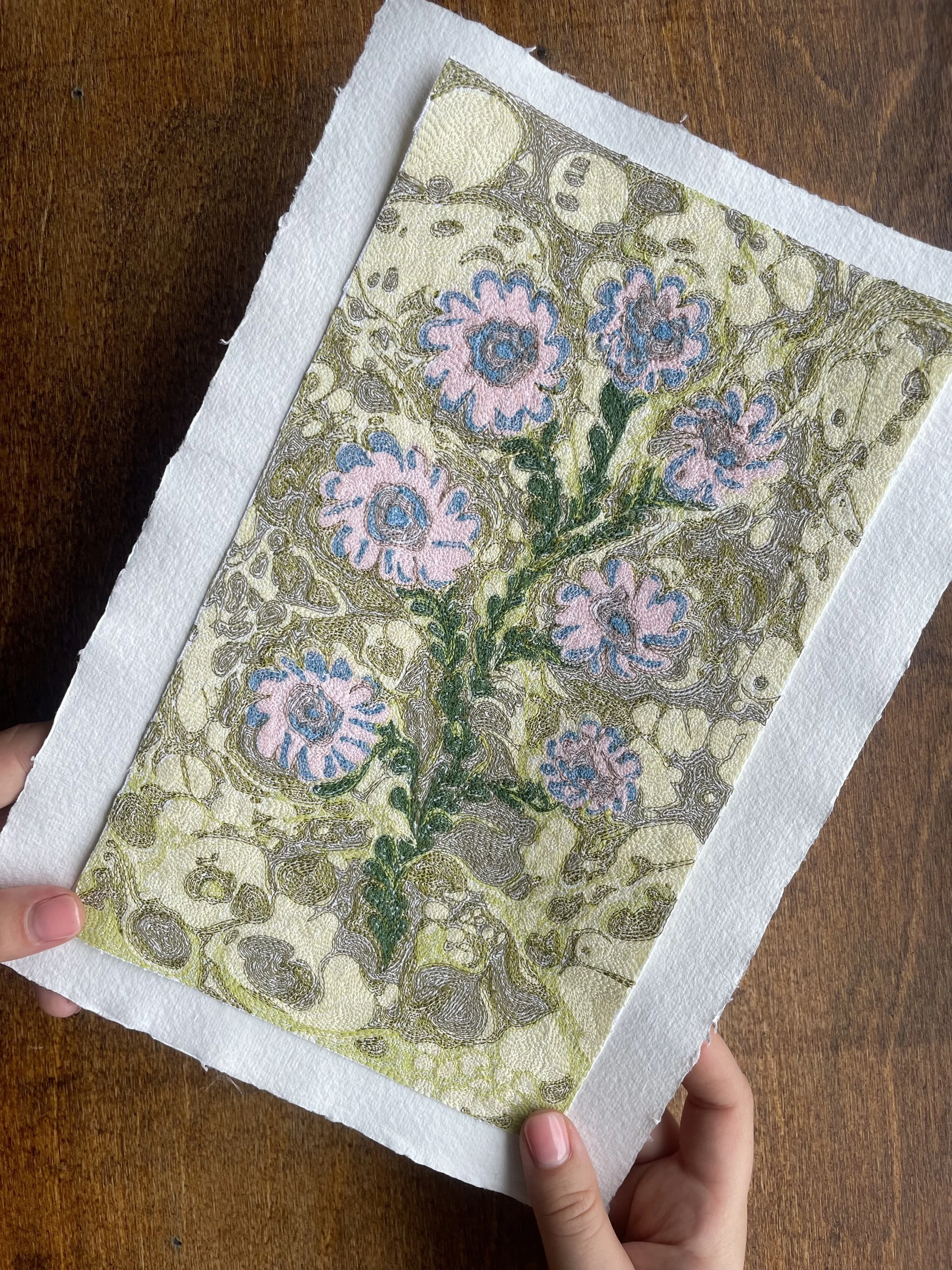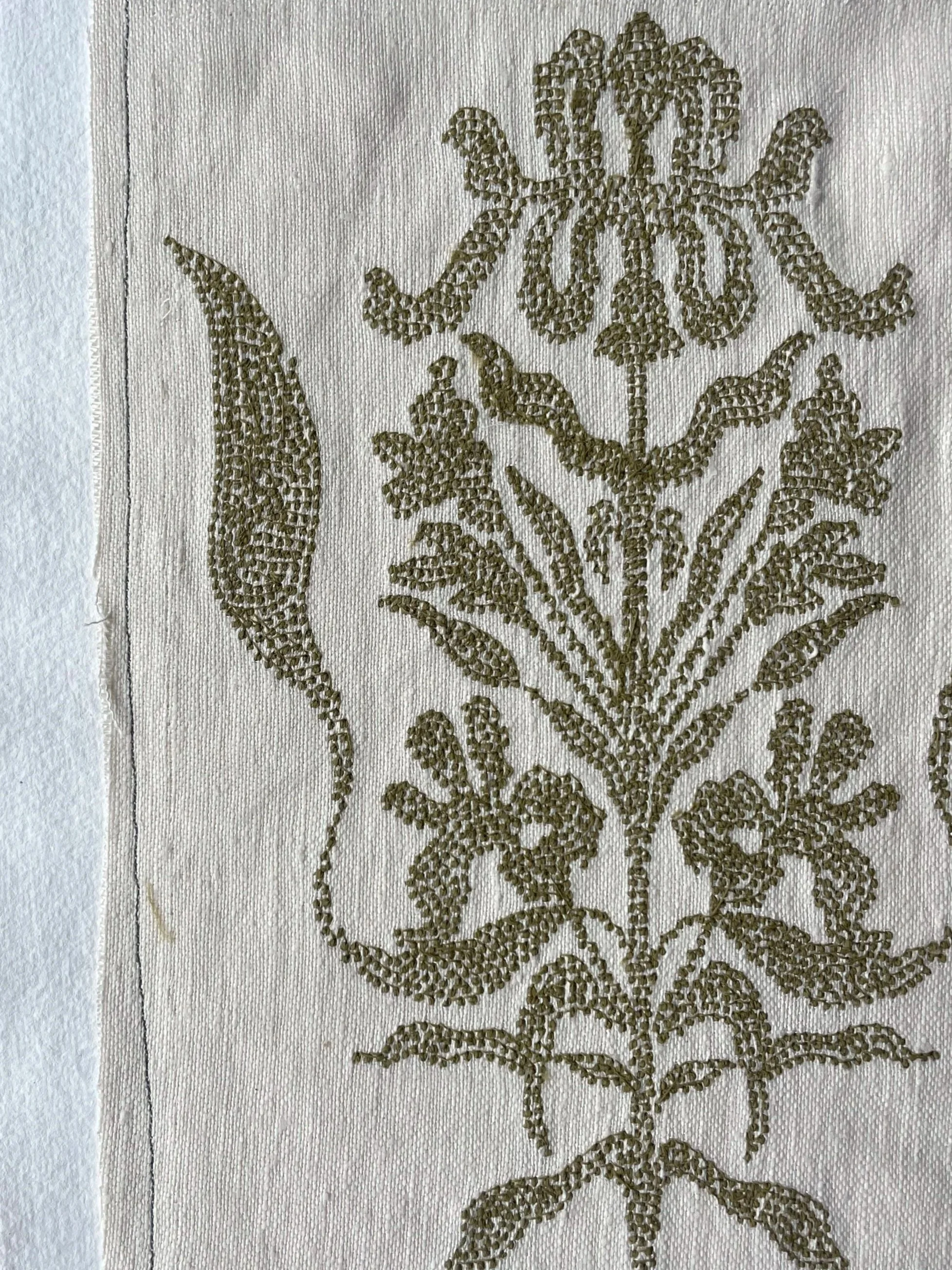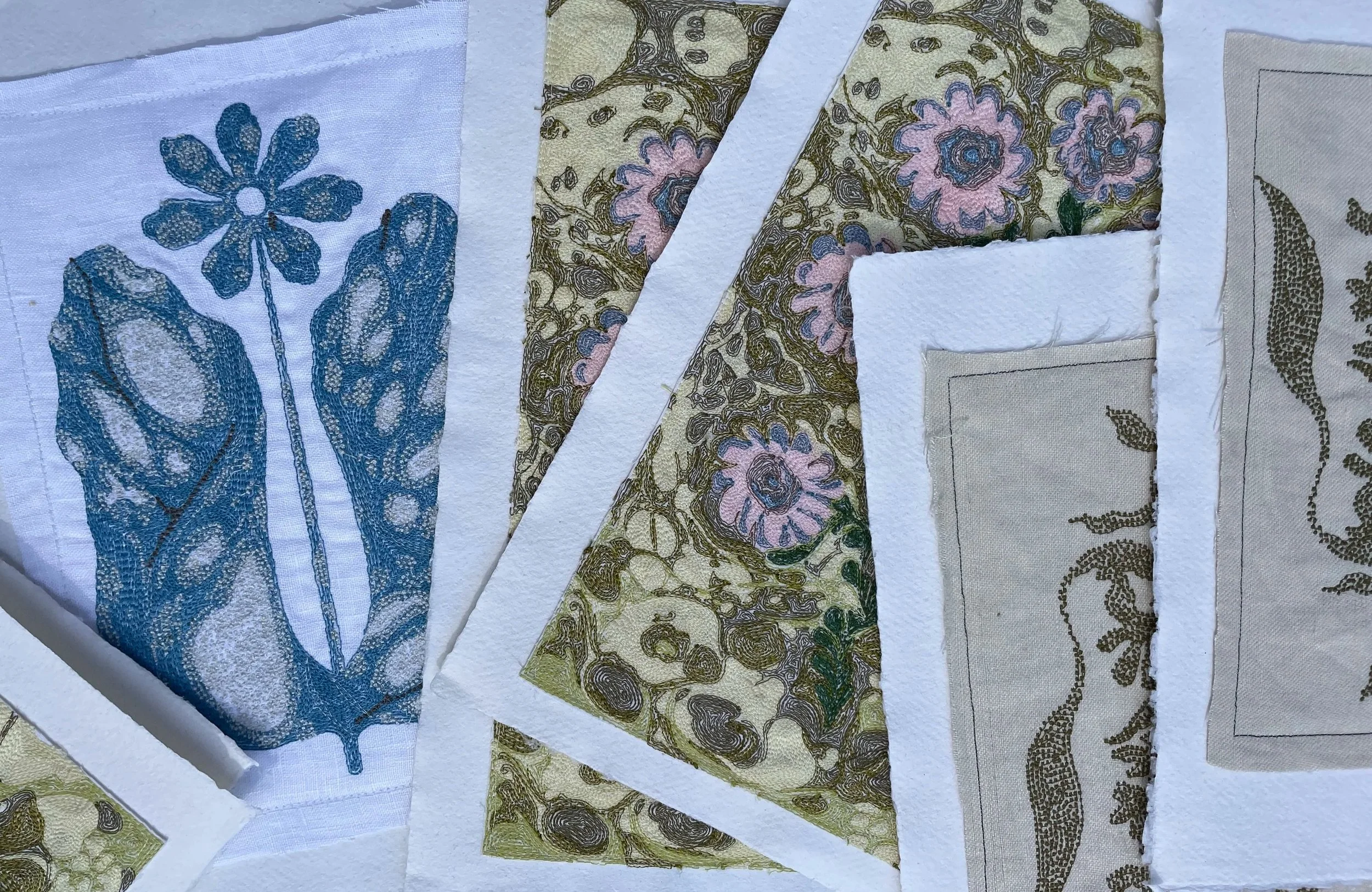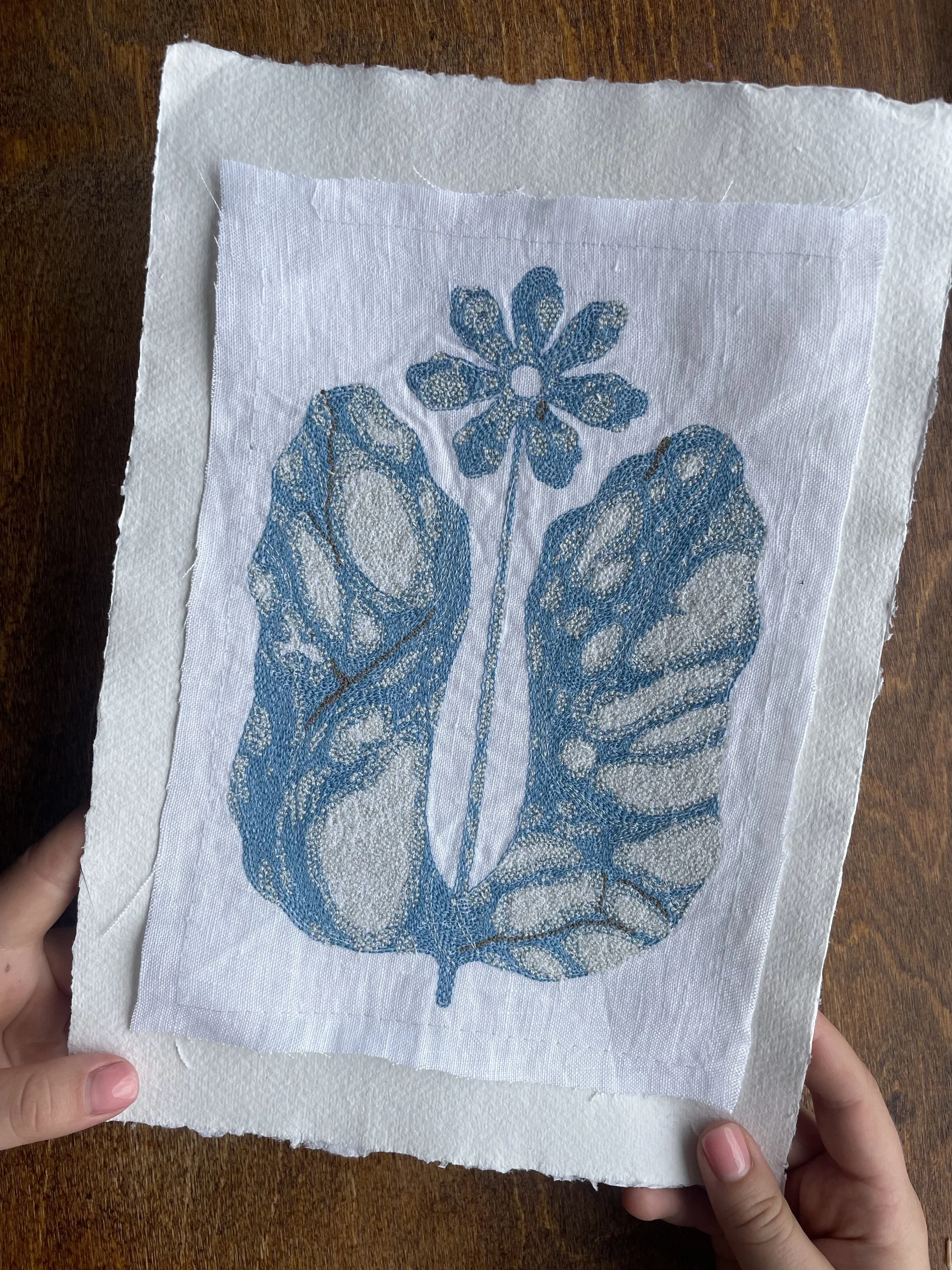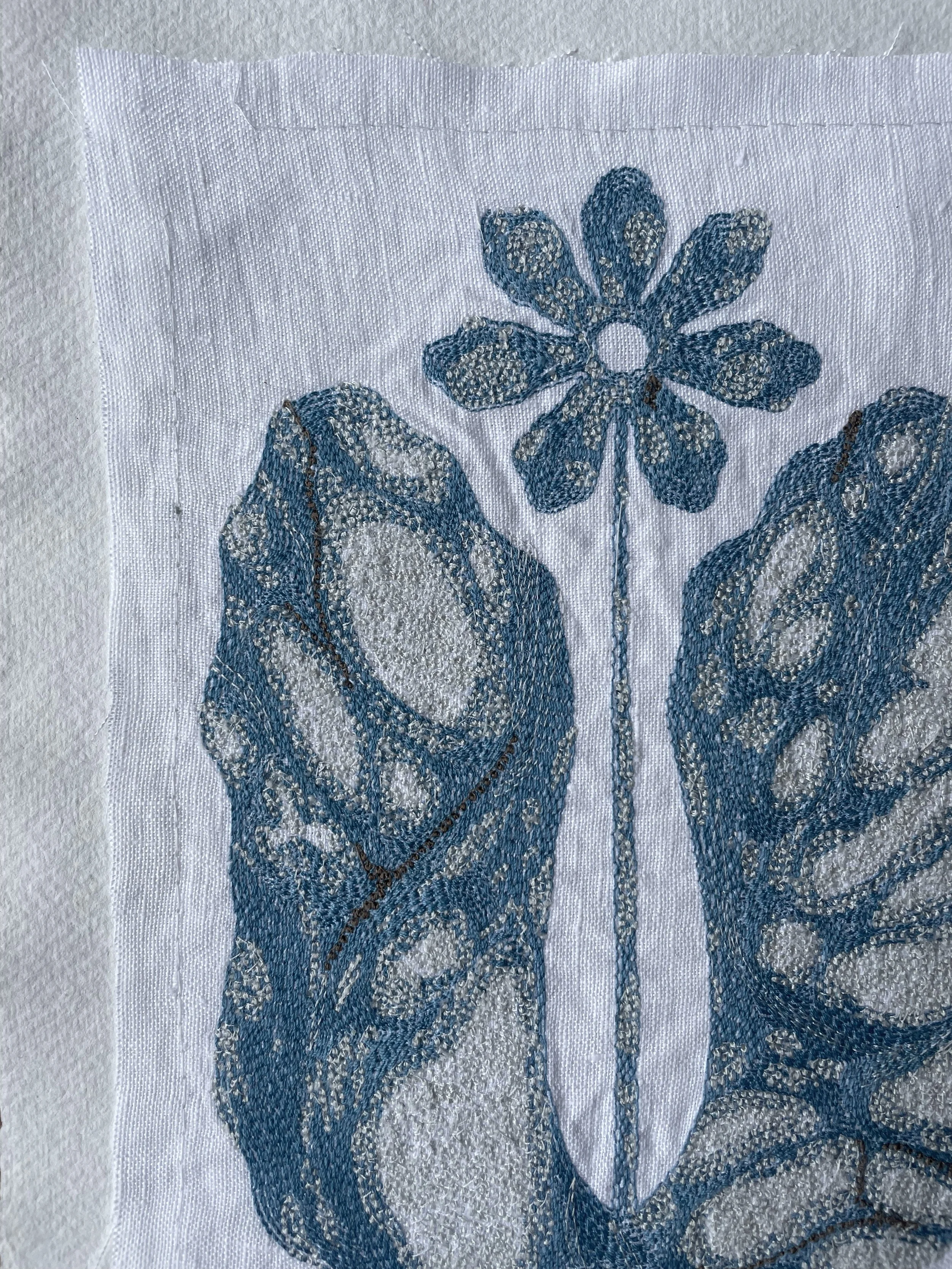 Embroidery in collaboration with Morgan Elvington Walker’s, using ceramic threads on a cotton base, mounted onto handmade paper.
