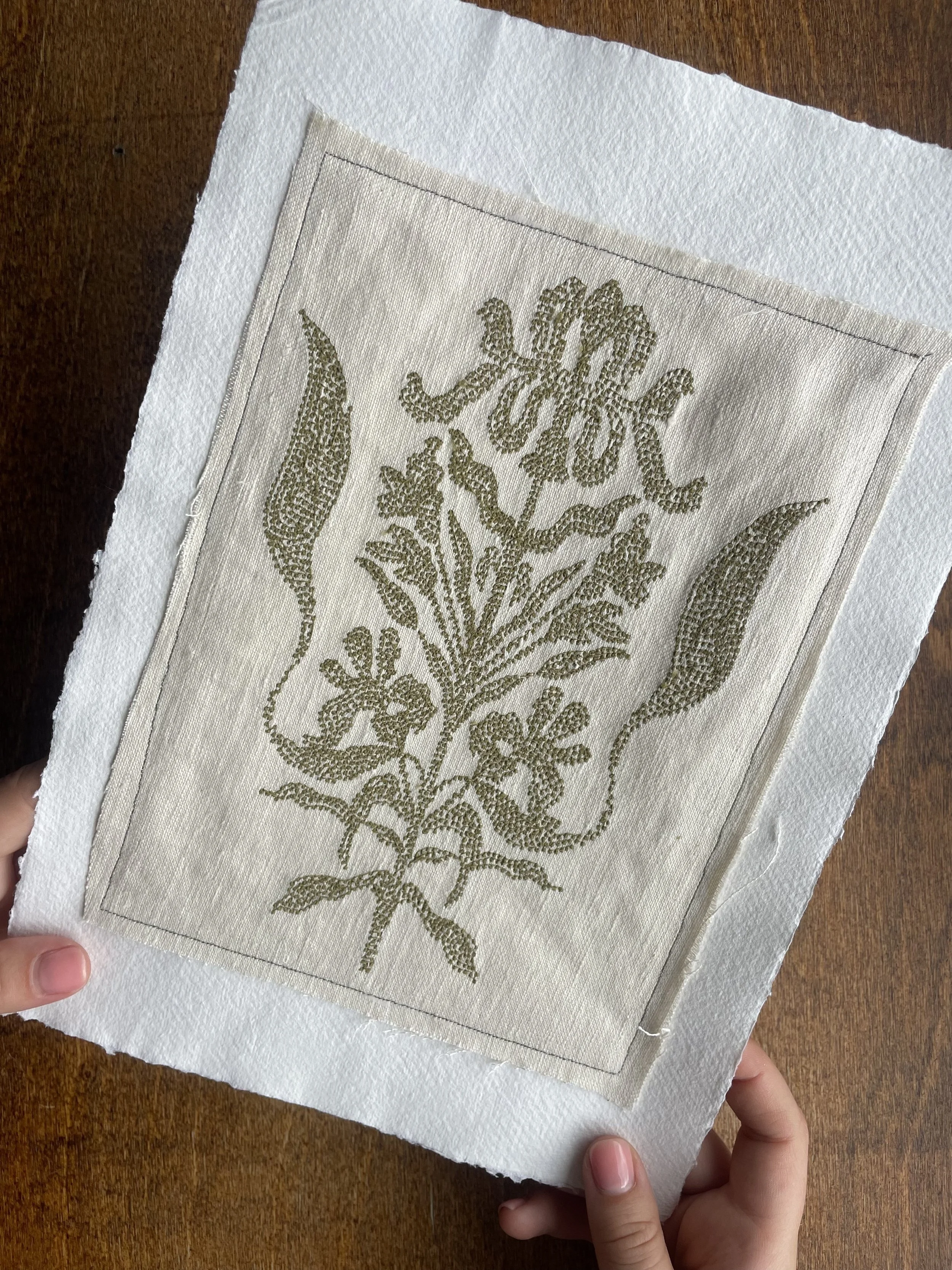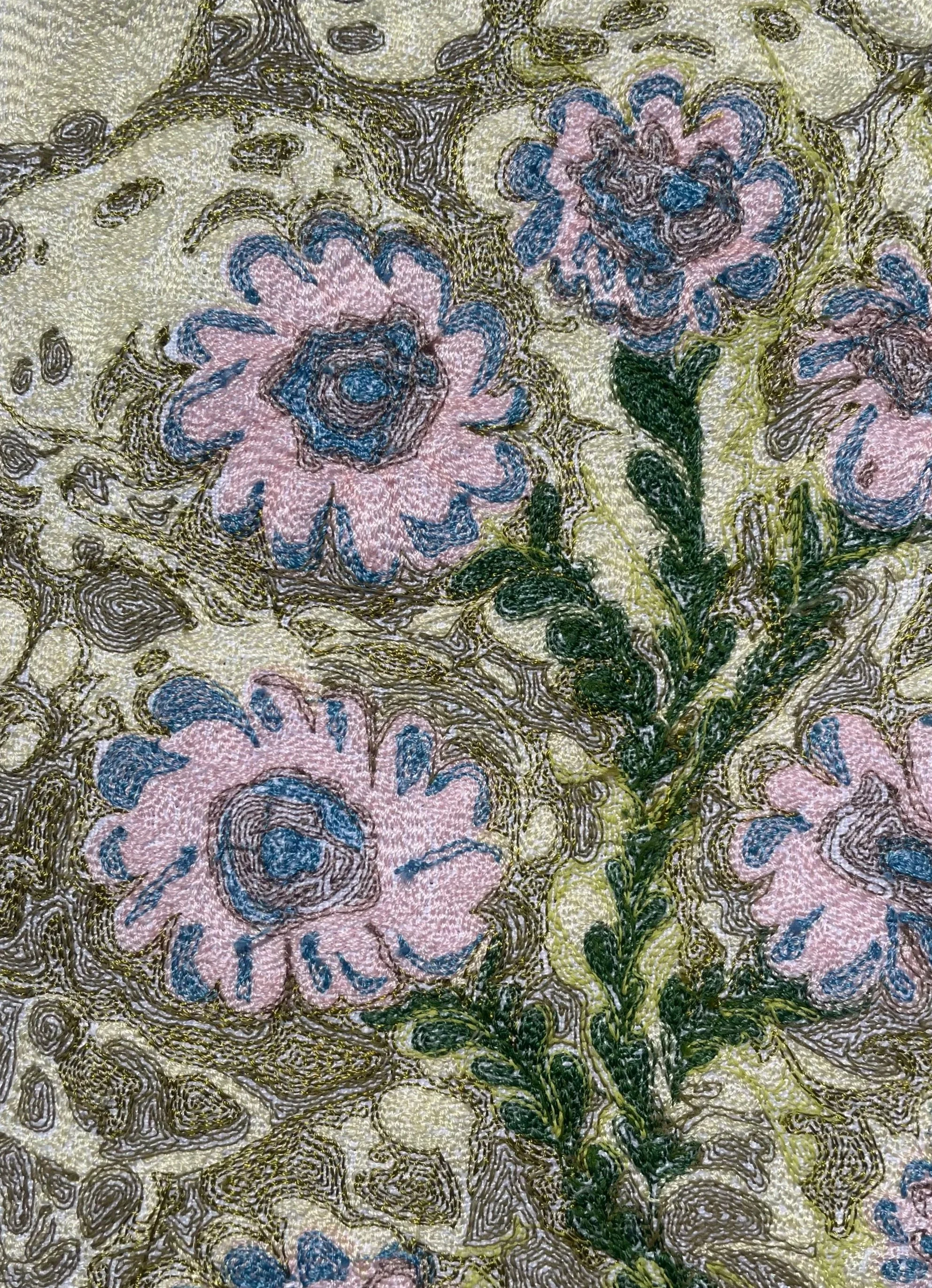 With designs inspired by the beauty of gardens and natural forms. Morgan's work was translated into embroidery pieces in our South-East London studio, using techniques like string stitch and maze fill.